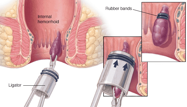 A rubber band is placed around the base of the Hemorrhoids with the help of a special instrument, cutting off the blood supply to the hemorrhoids .The hemorrhoids then shrinks, shrivels up, dies & ultimately falls off leaving some scar tissue which support the veins in the area. Preventing them to distend or bulge in to the cavity.